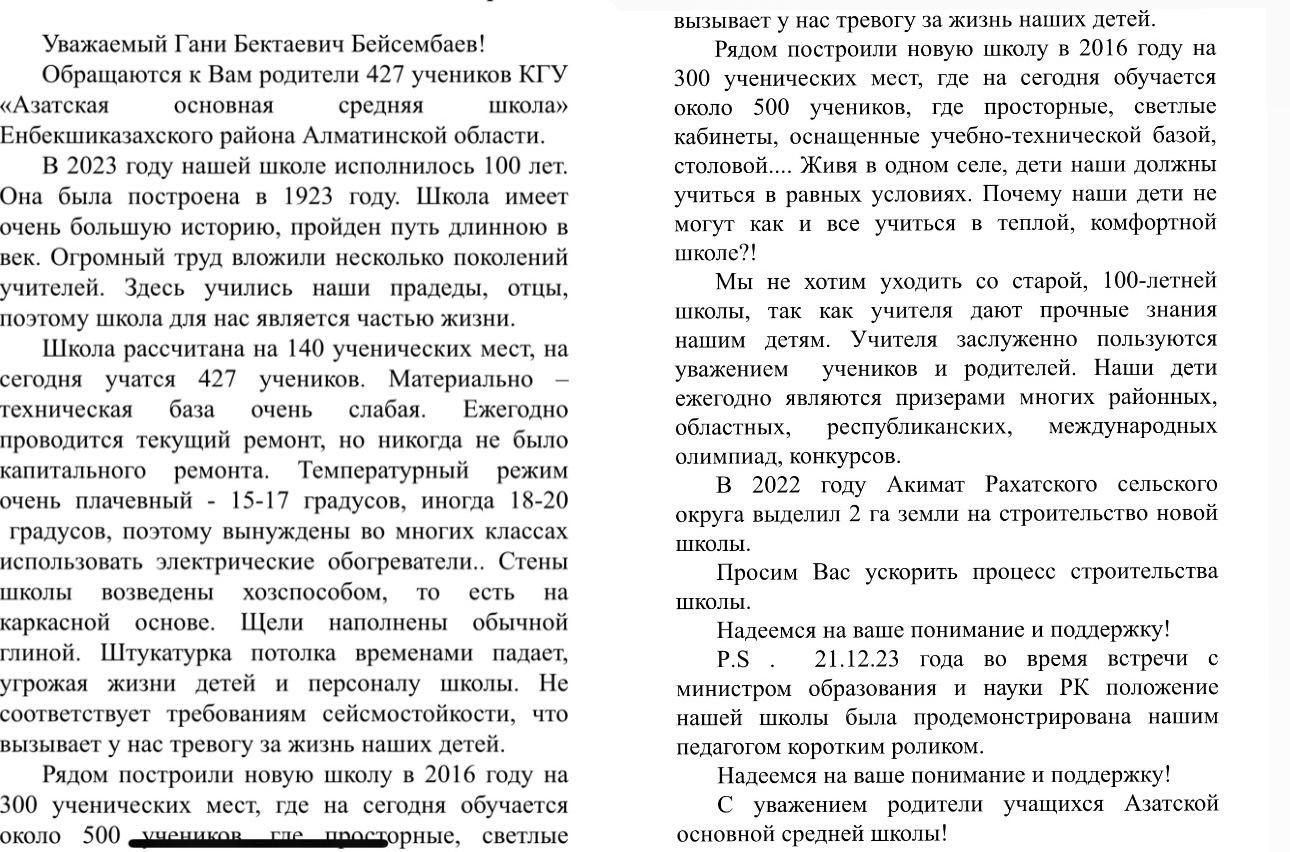 “Біз 100 жылдық мектептен кеткіміз келмейді. Мұнда мұғалімдер мықты, балаларымыз жыл сайын түрлі деңгейдегі олимпиадалардың жүлдегері атанып жүр”, – деп жазылған хатта.
