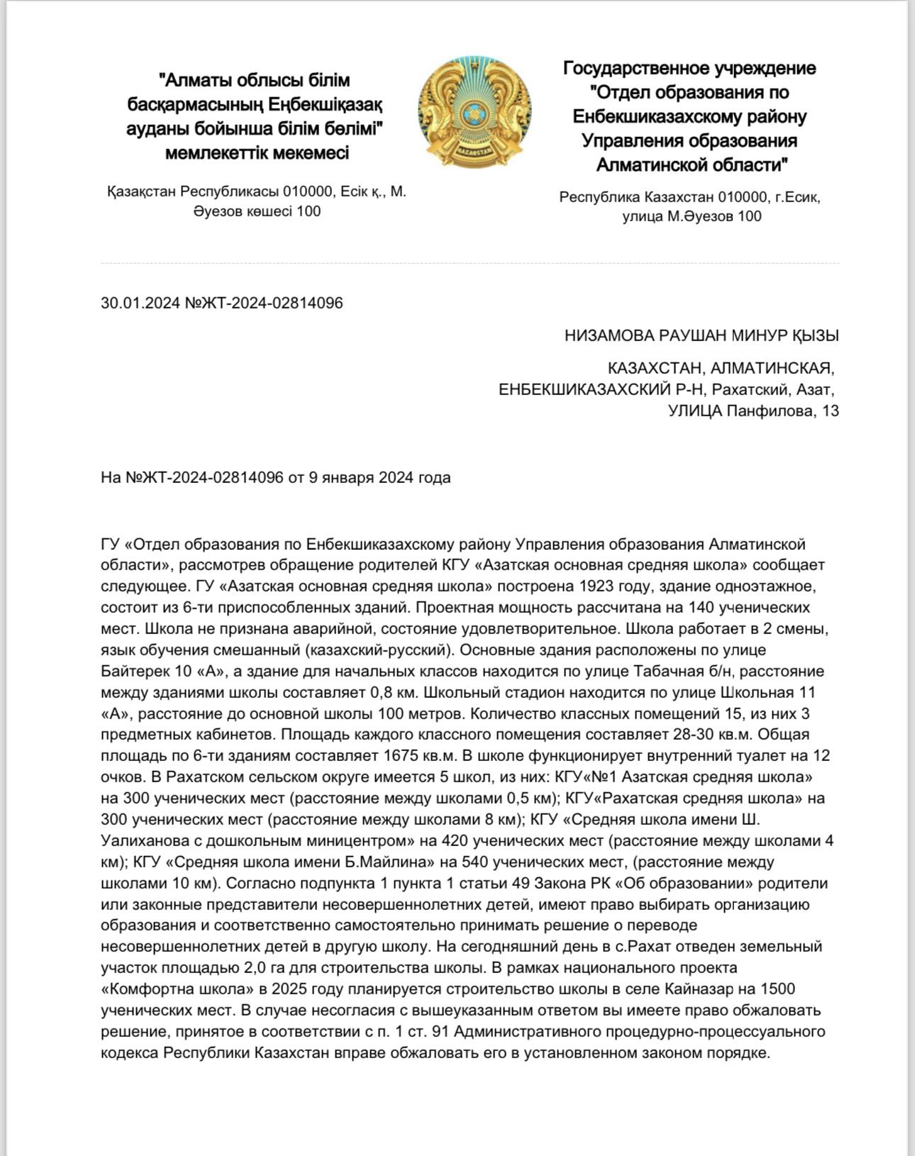 Еңбекшіқазақ аудандық білім бөлімі де ата-аналарға жауап берген. Бұл жауапта мектептің жағдайы “қанағаттанарлық” деп бағаланған.