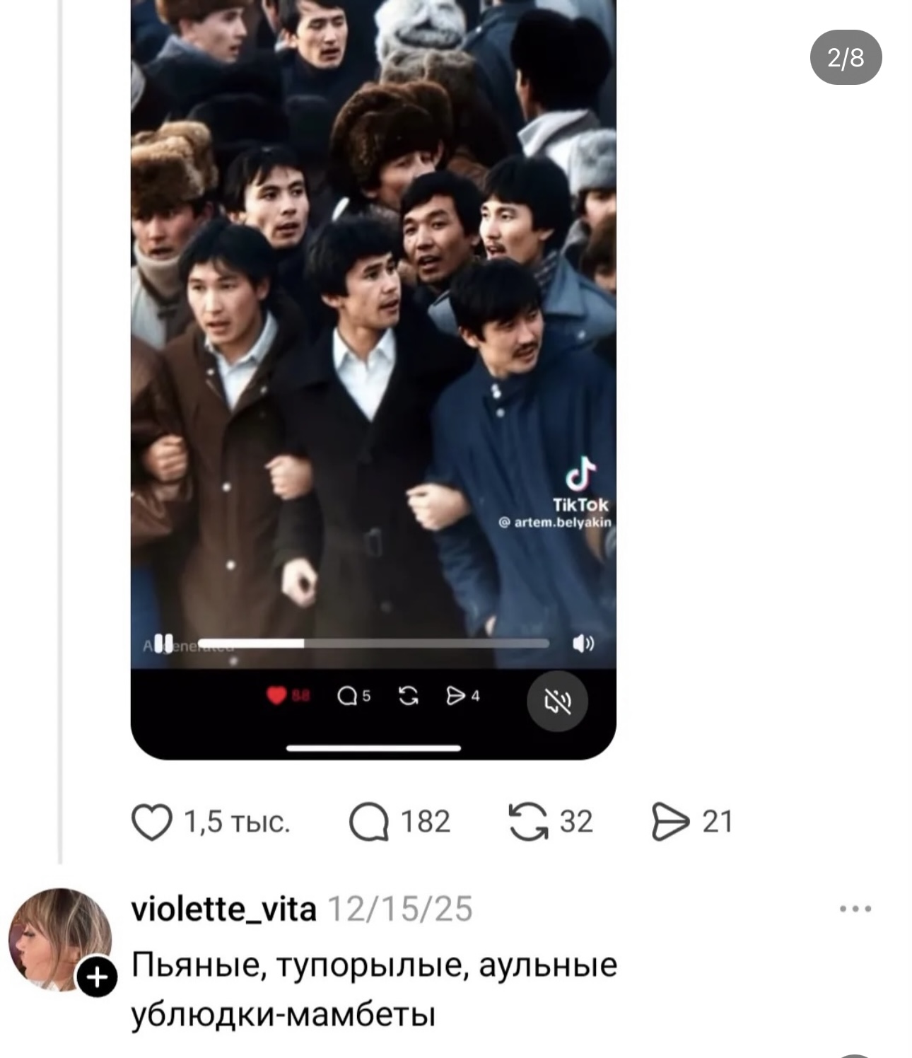 Еске салайық, бұған дейін әлеуметтік желілерде Алматы тұрғыны Виолеттаның қазақтарға қатысты қорлайтын сөздер айтқан жазбасы тараған еді. Ол Threads платформасында Желтоқсан оқиғасына қатысушыларды "топастар", "мамбеттер", "ауылдан келгендер" деп кемсіткен.