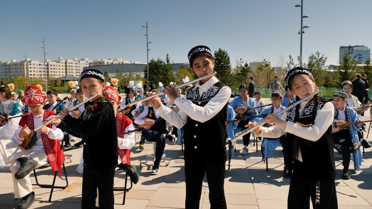 Іс-шараға қала мектептерінен 2000-ға жуық оқушылар қатысып, олар бір мезетте күйші-композитор Қаршыға Ахмедияровтың «Алтын ұя» күйін орындады.