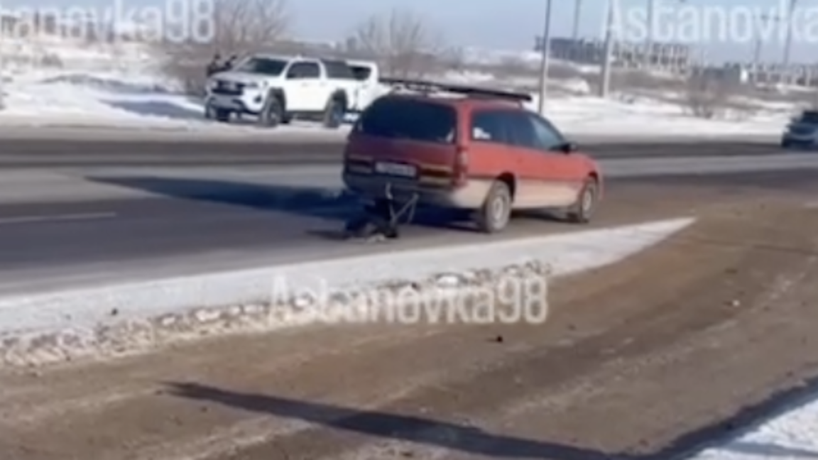 Астана тұрғыны итін көліктің артына байлап алып сүйреген. Оқиға видеоға түсіп қалған. Бұл жайт әлеуметтік желілерде тараған соң қоғамда резонанс тудырды, деп хабарлайды Dalanews.kz.