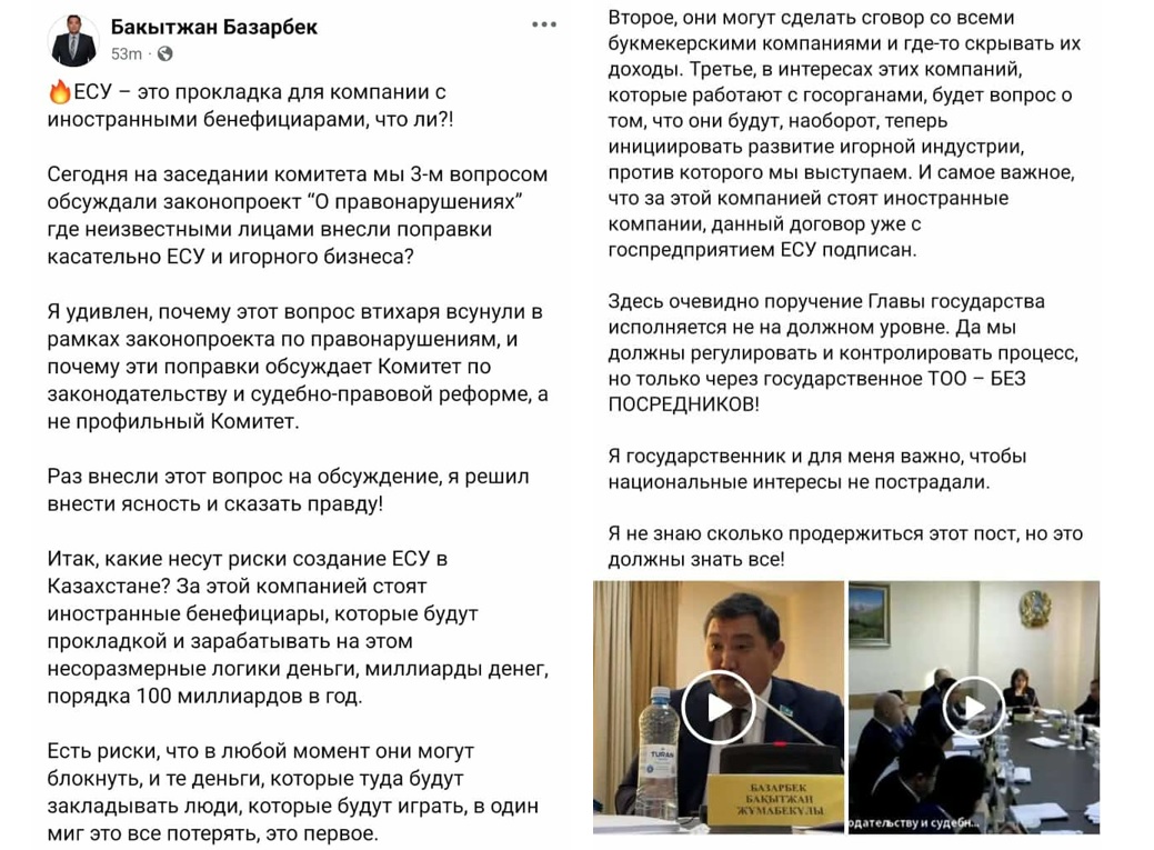 «Бүгін комитет отырысында үшінші мәселе ретінде «Әкімшілік құқықбұзушылықтар туралы» заң жобасын талқыладық. Сол заң жобасына белгісіз біреулер БЕАЖ бен құмар ойын бизнесіне қатысты түзетулер енгізіп жіберген», деп жазды Базарбек, артынан жойылып кеткен постында.