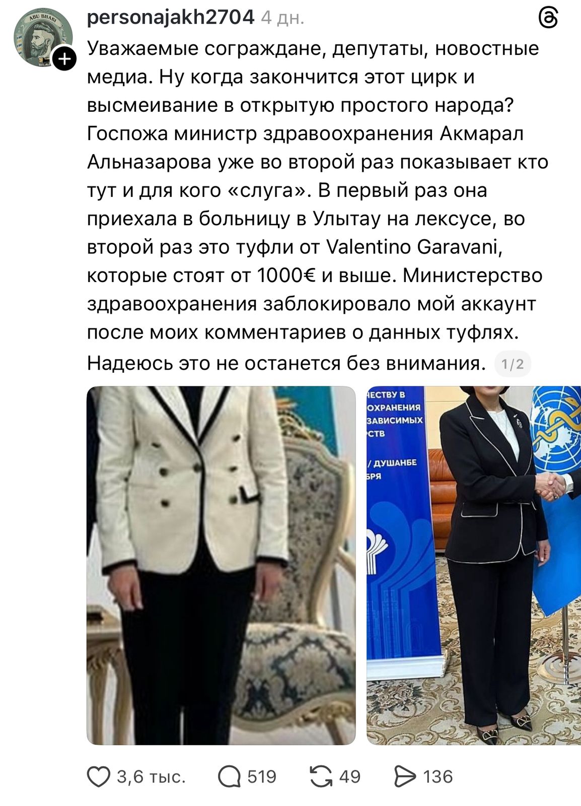 "Қашанға дейін қарапайым халықты осылайша ашықтан-ашық мазақ етіп, циркке айналдырып жүре бермек? Денсаулық сақтау министрі Ақмарал Әлназарова ханым екінші рет "кім кімге қызмет етуі тиіс" екенін анық көрсетіп отыр. Бірінші рет ол Ұлытаудағы ауруханаға Lexus көлігімен келген еді. Екінші рет – Valentino Garavani маркасындағы туфлиімен көзге түсті, олардың бағасы 1000 еуродан басталады.