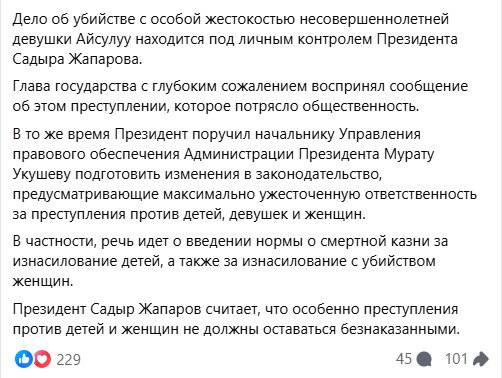 Мұндай шешім шығаруға 17 жастағы Айсулуу Мұқашеваны зорлап, аяусыз өлтіру оқиғасы себеп болды. Қылмысты жасаған деген күдікпен Бішкектің 41 жастағы тұрғыны ұсталды. Тергеуде ол Айсулууды ұрлап, зорлап, өлтіргенін айтқан. Марқұмның денесін Ыстықкөл маңына көміп, кейін қайта келіп, денені қазып алып, Боом шатқалына тастаған. Қайтыс болған қыздың туыстары күдіктінің бұған дейін де жыныстық зорлық жасағаны үшін жауапқа тартылғанын, бірақ жазадан құтылып кеткенін мәлімдеді.