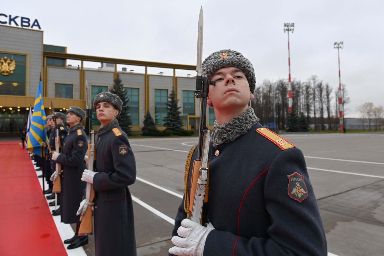 Внуково-2 әуежайында мәртебелі мейманның келуіне орай Мәскеу гарнизонының құрмет қарауылы мен әскери үрмелі оркестрі сап түзеді.