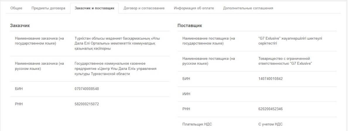 “Бұдан әрі “Тапсырыс беруші” деп аталатын Түркістан облысы мәдениет басқармасының “Ұлы Дала Елі Орталығы” мемлекеттік коммуналдық қазыналық кәсіпорны, жарғы негізінде әрекет ететін директор Дюсенбаева Гулжанат атынан бір тараптан және бұдан әрі «Өнім беруші» деп аталынатын "G7 Exlusive" жауапкершілігі шектеулі серіктестігі, Жарғы негізінде әрекет ететін Директор Жоспарова Айгерім Әбіләшімқызы атынан екінші тараптан, бұдан әрі бірлесіп «Тараптар» деп аталатындар, 16-бап 3-тармақ 32-тармақша мәдениет ұйымының, мәдениет саласындағы білім беру ұйымының, телерадио хабарларын тарату операторының сахналық көрсетілімдерді жүзеге асыру, өнер туындыларын көпшілік алдында орындау мен көрсету және мәдени құндылықтарды көрсету үшін тауарларды, жұмыстарды, көрсетілетін қызметтерді сатып алуы «Мемлекеттік сатып алу туралы» Қазақстан Республикасы Заңының (бұдан әрі – Заң), «Тікелей шарт тұжырымы бір дерекөздерден» мемлекеттік сатып алудың тәсілі негізінде осы көрсетілетін қызметтерді мемлекеттік сатып алу туралы шартты (бұдан әрі – Шарт) жасасты және мына төмендегі туралы келісімге келді”, — делінген келісімшарт мәтінінде.