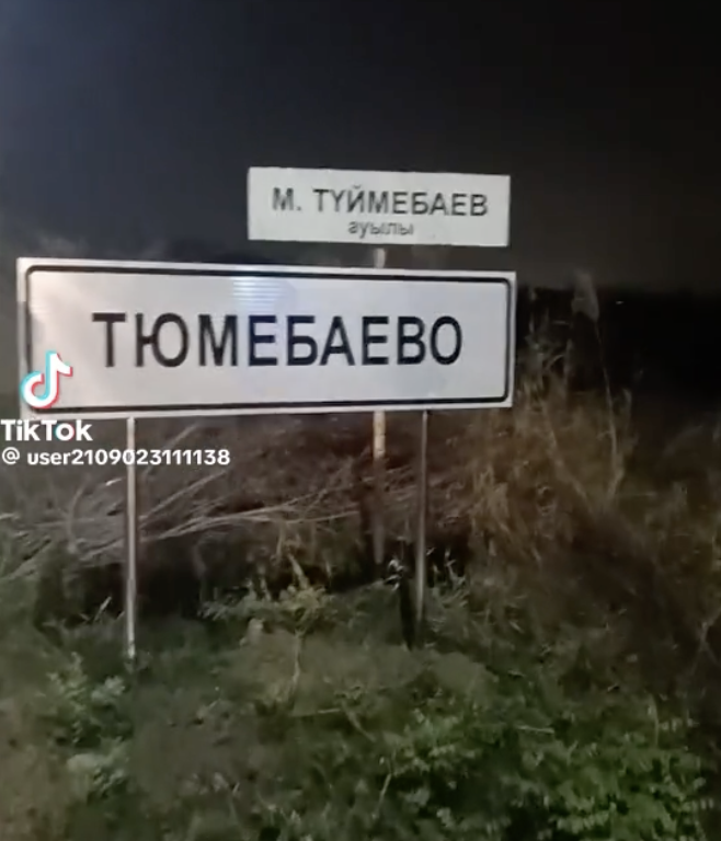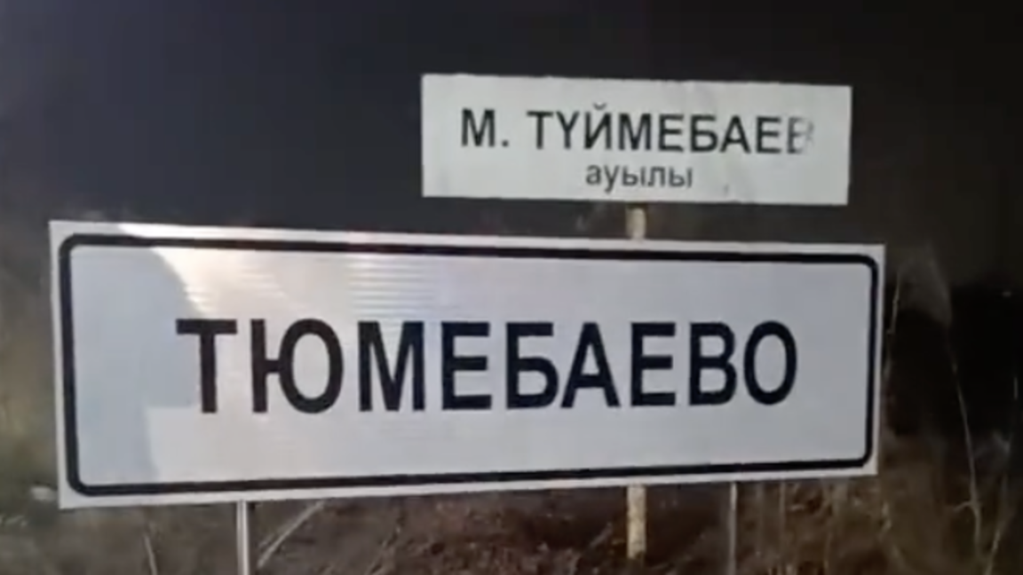 Желіде ауылға кіреберістегі белгі көрінетін видео тарады. Кадрда М.Түймебаев ауылы деген кішкентай тақтайшаның астында "Тюмебаево" деген жазу көрінеді.