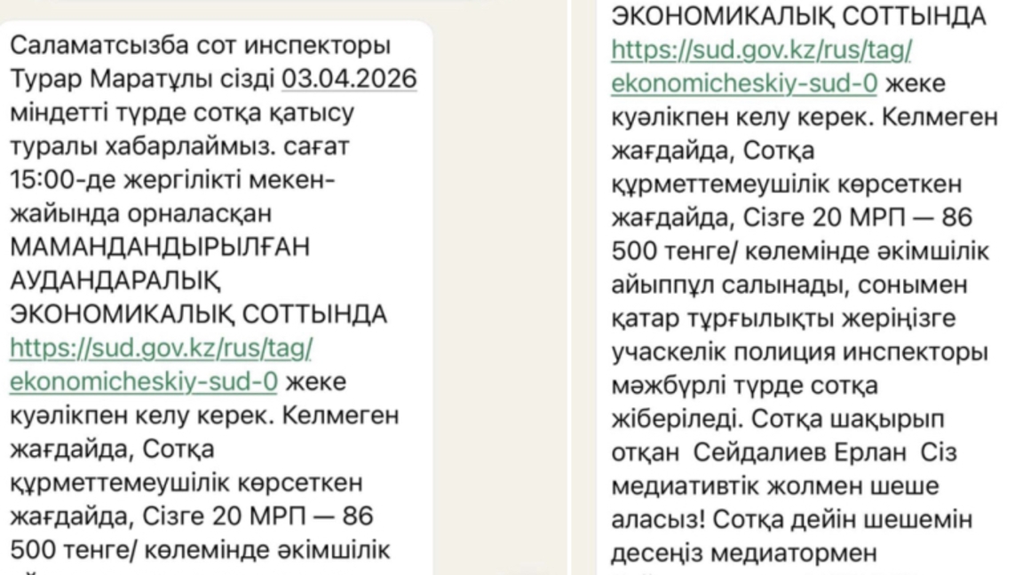 Habarlamada "sot otyrysyna qatysýyńyz kerek, kelmegen jaǵdaıda aıyppul arqalaısyz, jaǵdaıdy sotqa deıin sheshemin deseńiz berilgen nómir arqyly habarlasyńyz" degen mazmunda aqparat berilip, arnaıy siltemege ótýdi suraıdy.