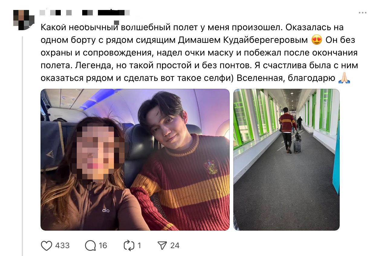 Желі қолданушысы Threads желісінде Димаш Құдайбергенмен ұшақта бірге отырғанын айтып, жазба жариялаған. Әншінің қарапайымдылығына таңғалған ол таңданысын жасырмаған.