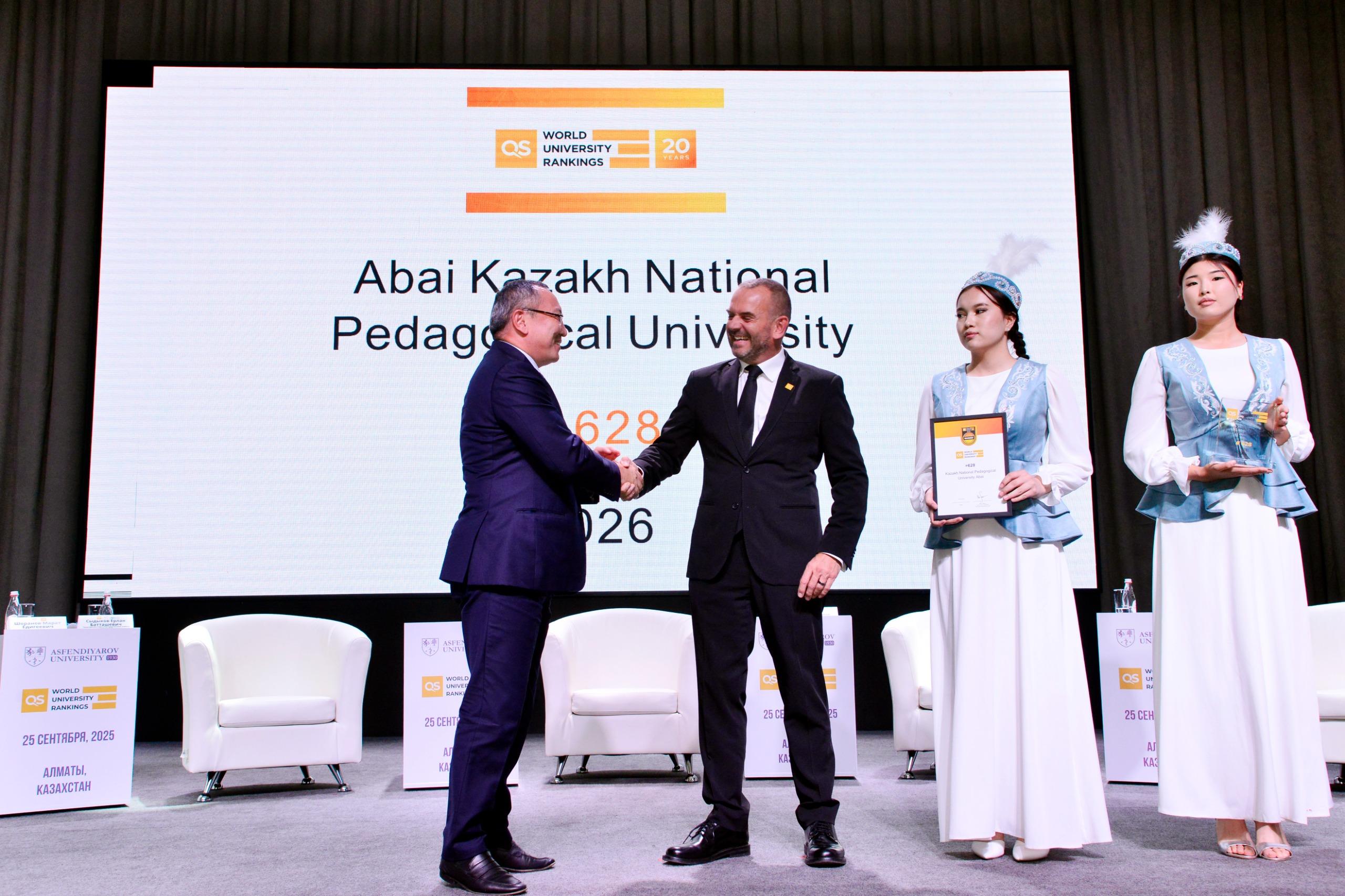 Бүгін халықаралық «QS World University Rankings – 2026» рейтингіне қатысушы жоғары оқу орындарына сертификаттар мен марапаттарды табыстау рәсімі өтті. Жаңа рейтингте Абай университеті 628-орынды иеленіп, өткен жылмен салыстырғанда бірден 43 позицияға жоғары көтерілді (671–680 аралығы). Осылайша, университет әлемнің үздік 650 жоғары оқу орнының қатарына кіріп, Қазақстанның алдыңғы қатарлы үздік 4 университетінің бірі ретінде өз орнын нығайтты. Сонымен қатар, ҚазҰПУ – Қазақстан мен Орталық Азиядағы педагогикалық білім беру саласының көшбасшысына айналды.