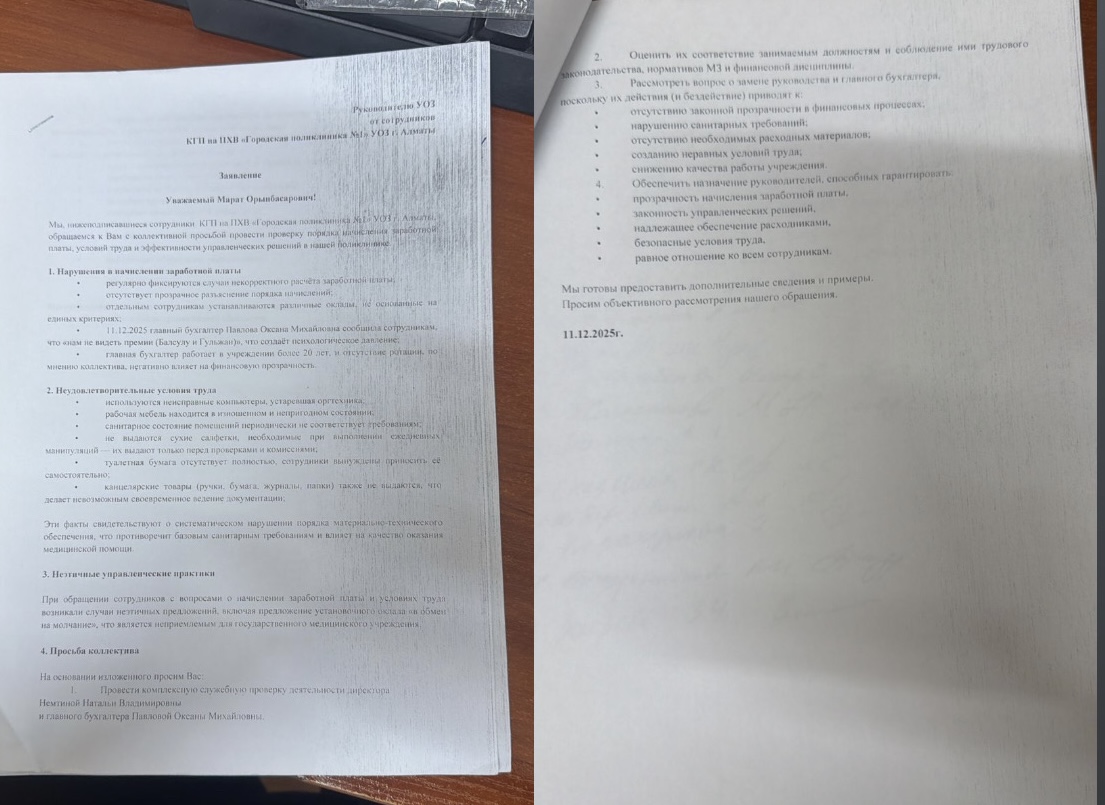 رەداكسيا قولىنا تۇسكەن جينالىس جازباسىندا ەمحانا باسشىسى نەمتينا ناتاليا ۆلاديميروۆنا قىزمەتكەرلەرگە جالاقى مەن قارجىلاندىرۋ ماسەلەسىنە قاتىستى تۇسىنىكتەمە بەرگەن.