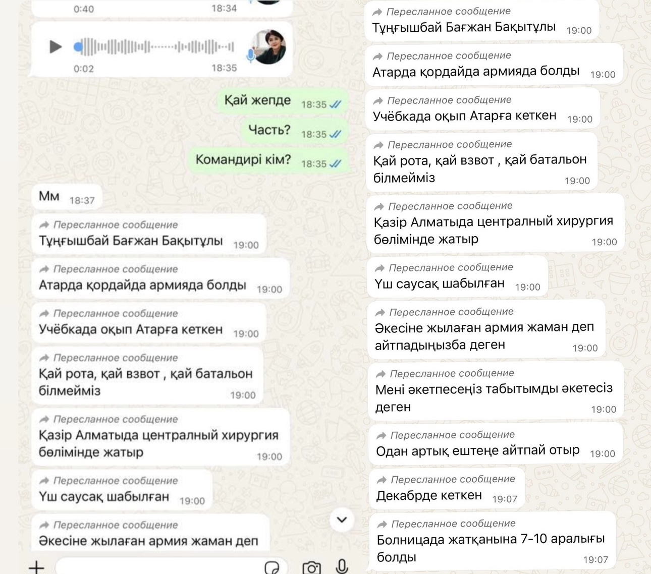 "ۇلكەن كەلىنىمنىڭ اعاسىنىڭ ۇلى اسكەرگە كەتكەن. الماتىدا وقۋ-جاتتىعۋدا بولىپ، جەلتوقسان ايىندا وتارعا اسكەري بورىشىن وتەۋگە بارعان. ءقازىر 10 كۇننەن بەرى الماتى قالالىق اۋرۋحاناسىنىڭ حيرۋرگيا بولىمىندە جاتىر. ءۇش ساۋساعىنان ايىرىلىپتى"، - دەپ جازدى ول.