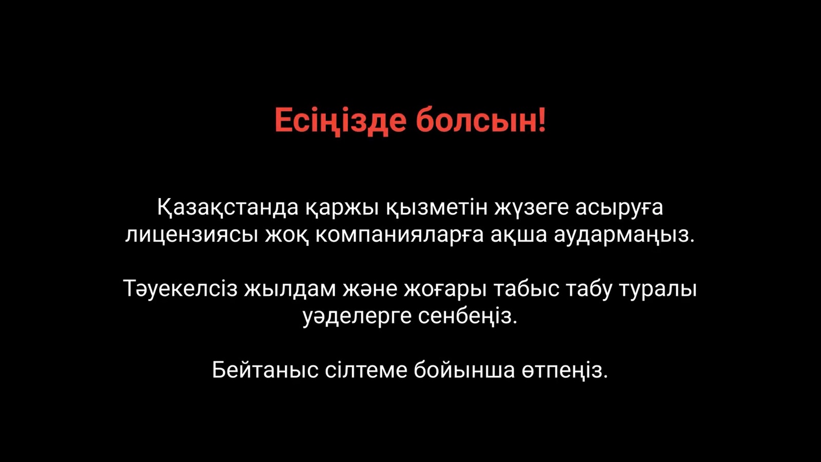 ەسىڭىزدە بولسىن، قانشالىقتى جەڭىل تابىسقا قىزىقتىرسا دا جانە ءسىزدى شاقىرعان ادامدار قانشالىقتى سەنىمدى كورىنسە دە مۇنىڭ ناتيجەسى بىرەۋ-اق - ۋادە ەتىلگەن بايلىقتىڭ ورنىنا اقشادان ايىرىلۋ مەن قارىزدار.