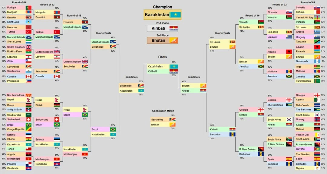 فينالدا قازاقستان تۋى كيريباتي ەلىنىڭ تۋىنان باسىم ءتۇستى. جارتىلاي فينالدا سەيشەل ارالدارىنىڭ تۋى جارىستان شىعىپ قالدى. ال بۋتان تۋى ءۇشىنشى ورىندى يەلەندى بۇل ەلدىڭ تۋىندا ايداھار بەينەلەنگەن.