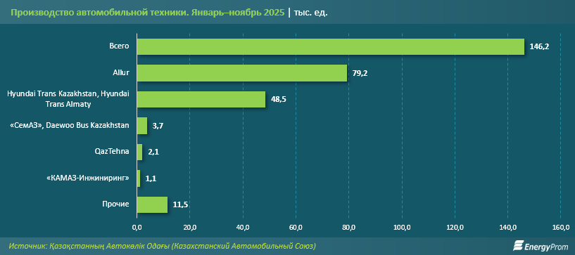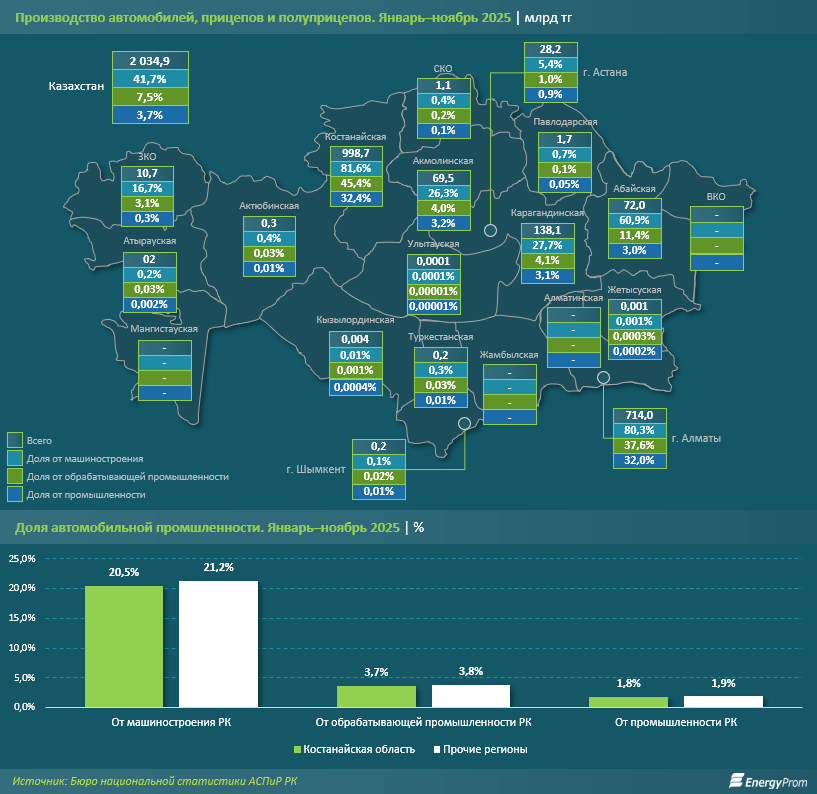2025 جىلدىڭ قاراشا ايىندا اۆتوموبيلدەر، تىركەمەلەر جانە جارتىلاي تىركەمەلەر ءوندىرىسىنىڭ قۇنى 311 ملرد تەڭگەنى قۇرادى، ال قاڭتار–قاراشا كەزەڭىندەگى كولەم 2 ترلن تەڭگەدەن استى. بۇل — 2024 جىلدىڭ سايكەس كەزەڭىمەن سالىستىرعاندا اقشالاي ماندە 25،4%-عا كوپ (ءنوس — 115،2%). ءوندىرىستىڭ ءوسۋى اۆتوپرومنىڭ ەل يندۋسترياسىنداعى ءرولىن كۇشەيتتى: اۆتوكولىك ونەركاسىبى ماشينا جاساۋدىڭ 41،7%-ىن قۇرادى جانە سالاداعى نەگىزگى سەگمەنت مارتەبەسىن نىعايتتى.
