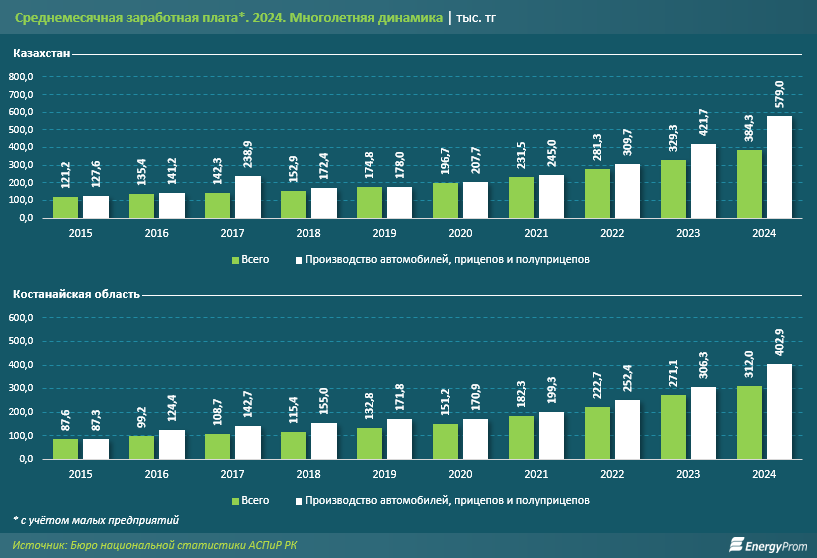 جالاقى ديناميكاسى اۆتوپرومنىڭ ەكونوميكالىق ءرولىنىڭ وزگەرىسىن دە كورسەتىپ وتىر. 2015 جىلى اۆتوموبيل ونەركاسىبىندەگى ورتاشا ايلىق جالاقى رەسپۋبليكالىق دەڭگەيدەن نەبارى 5،3%-عا جوعارى بولدى. ال 2024 جىلدىڭ قورىتىندىسى بويىنشا ايىرماشىلىق ەداۋىر ۇلعايدى: سالادعى ورتاشا جالاقى ەل بويىنشا ورتاشا كورسەتكىشتەن شامامەن 1،5 ەسە كوپ — 579 مىڭ جانە 384،3 مىڭ تەڭگە.