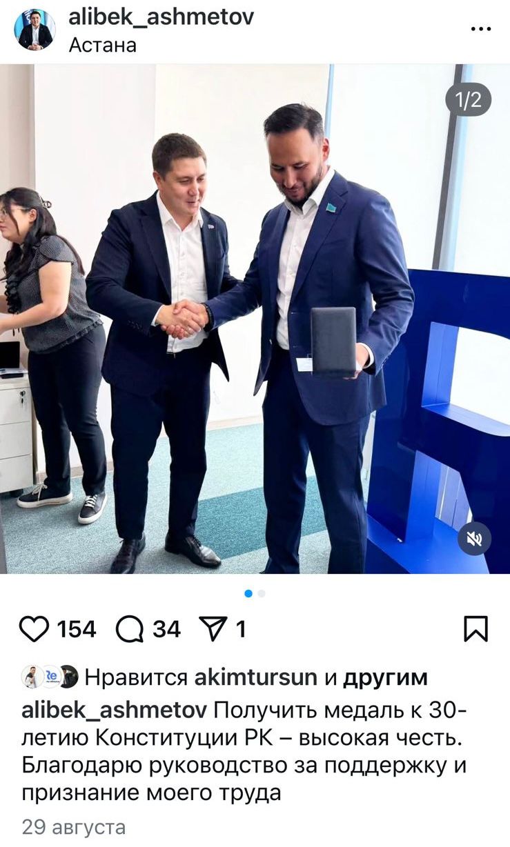 وسىنداي "كادرلىق ساياساتتاعى جانە ايماقتاردى نىعايتۋعا ۇلەس قوسقانى ءۇشىن" الىبەك اشىمەتوۆ پارتيا ءتوراعاسىنىڭ قولىنان “قازاقستان كونستيتۋسياسىنا 30 جىل” دەگەن مەدالمەن ماراپات الىپ، ءوزىنىڭ الەۋمەتتىك جەلىدەگى پاراقشاسىندا بىلاي دەپ جازبا قالدىردى: “قازاقستان رەسپۋبليكاسى كونستيتۋسياسىنىڭ 30 جىلدىعىنا ارنالعان مەدال الۋ – زور مارتەبە. ەڭبەگىمدى باعالاپ، قولداۋ كورسەتكەن باسشىلىققا العىسىمدى بىلدىرەمىن”.