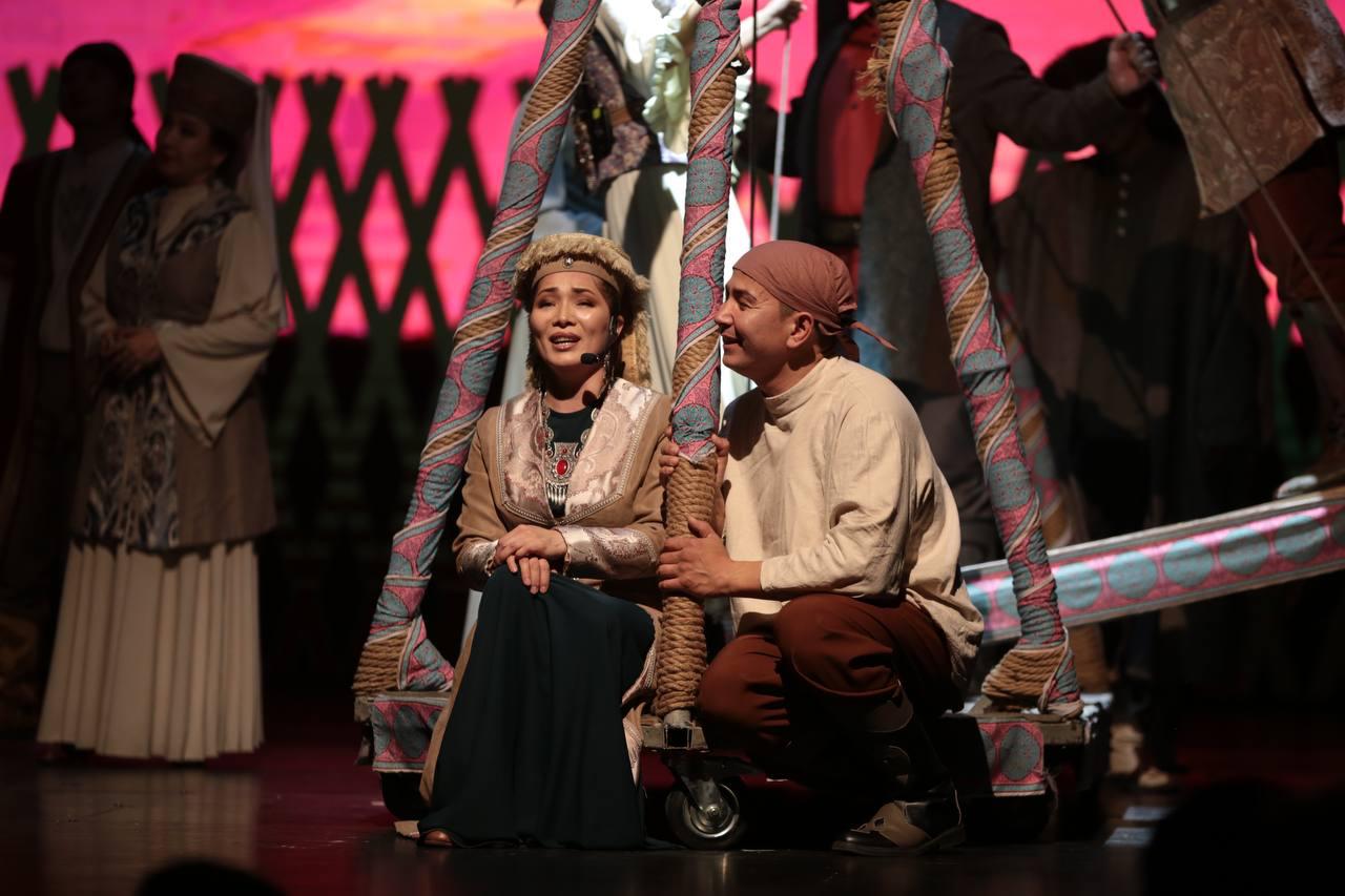 تەاتردىڭ بارلىق قويىلىمدارى – جاندى داۋىستا، 20-دان استام ۇلتتىق اسپاپتى مەڭگەرگەن «الاتاۋ» ەتنو-فولكلورلىق ءانسامبلىنىڭ سۇيەمەلدەۋىمەن ءوتتى. سونىمەن قاتار، ترۋپپا قۇرامىندا كاسىبي بي ءانسامبلى، ءداستۇرلى انشىلەر، اقىندار مەن جاس اكتەرلەر ونەر كورسەتتى.
