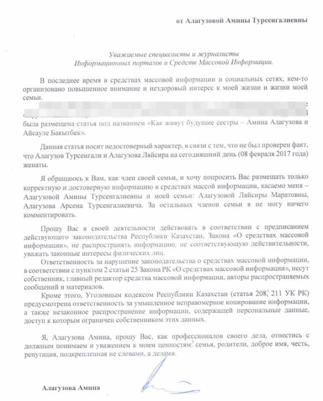 Әмина Алакөзованың айтуынша, соңғы кездері қоғамда оның және отбасының өміріне қызығушылық күрт артқан. Ол еліміздегі бір басылымда өзі және Баян Есентаеваның қызы туралы негізсіз мақала жарияланғанын айтады. Ондағы дәйектердің шындыққа еш сәйкес келмейтінін айғақтаған ол жалпы баспасөзден отбасына қатысты негізсіз фактілерді жарияламауды талап етеді.