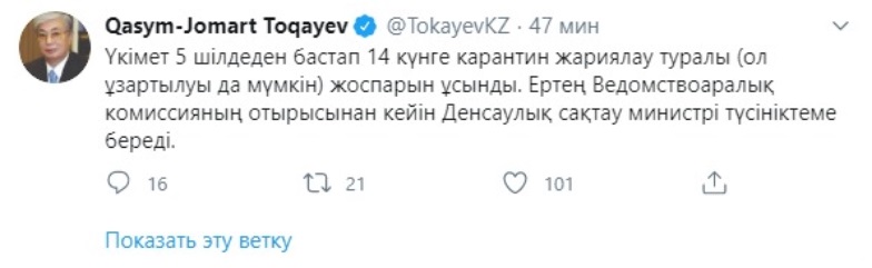 «Үкімет 5 шілдеден бастап 14 күнге карантин жариялау туралы (ол ұзартылуы да мүмкін) жоспарын ұсынды. Ертең Ведомствоаралық комиссияның отырысынан кейін Денсаулық сақтау министрі түсініктеме береді» деп жазды Мемлекет басшысы.