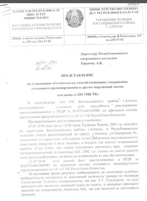 Арада 20 күннен аса уақыт өткеннен кейін ата-ана маған болған жайтты баяндап, Төлегенді жұмыстан шығару турасында талап қойды. Бұдан кейін ол кісіге бір ата-ана айтты екен деп мәселенің ақ-қарасын анықтамай жатып бапкерді жұмыстан шығара алмайтынымды айттым. Бірақ бұл мәселені жабулы қазан күйінде қалдырмайтынымды ата-анаға түсіндірдім. Сол кезде колледждегі балалардың бәрі жазғы демалыста жүргеннен кейін бұл істі оқу жылы басталғанда қолға алатынымызды айтып, ата-анаға жазбаша түсініктеме бердік. Артынша, бұл мәселені ата-аналар комитетінде талқылап, болған жайтты колледж басшылығынан 20 күннен астам уақыт бойы жасырғаны үшін Төлегенге сөгіс жарияладық.