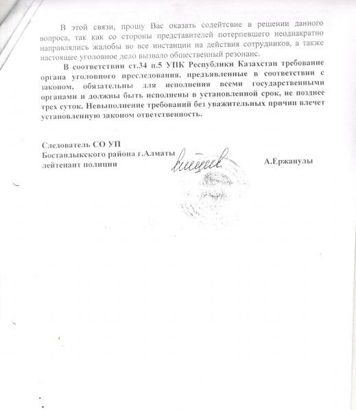 Ал арада біршама уақыт өткеннен кейін Наргиздің ата-анасы Төлегеннің атынан ішкі істер орындарына арызданды. Осыдан кейін маған ішкі істер органдарынан ата-ананың шағымы бойынша іс қозғағандарын, істің ақ-қарасы анықталғанша заң бойынша Төлегенді жұмыстан шеттету турасында хат жолдады.