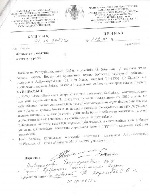 – Бұл дау 2017 жылы тұтанған болатын. Сол кезде колледжіміздегі таэквондошыларды дайындайтын екі бапкеріміз Есбол Сұлтанбеков пен Төлеген Төлемұратов сөзге келіспей қалады. Сол сәтте Төлеген Есболға қол көтереді, бұдан кейін Есбол қарап қалсын ба, ол да қарымтасын қайтарады.
