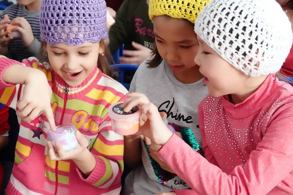 Тұрмысы төмен жанұялардың балалары білім алатын оқу орнына арнайы барған компания өкілдері оларға бас киімнен бөлек, ойыншақтар да сыйға тартты.