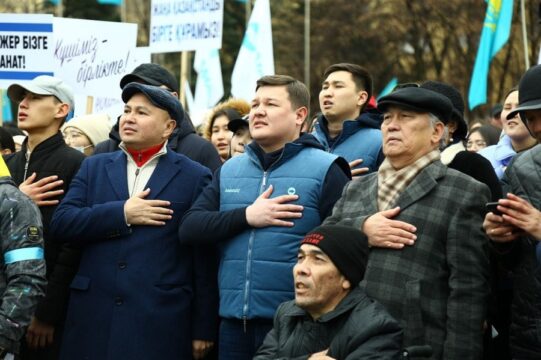 Митинг Қазақстанның мемлекеттік әнұранын орындаумен басталды.