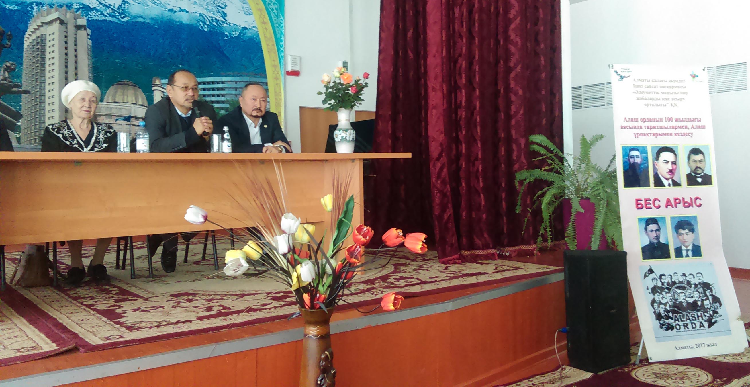 Кеш барысында оқушыларға Алаш қозғалысы жайында естеліктер айтылды. Алаш идеясын бүгінгі жас ұрпақ бойына сіңіру мақсатында өткізілген кездесу жас жеткіншектердің зердесінде қалары сөзсіз. Алаш арыстары көсемсөзде, ақындық өнерде, кәсіби маман ретінде де арттарында өшпестей із қалдырды. Олардың еңбектерін терең де түбегейлі зерттеу қазіргі күннің, бүгінгі жастарымыздың еншісінде. Өз заманындағы озық біліммен қаруланып, түрлі кәсіби маман иелері ретінде Алаш зиялыларының қай қырын алсақ та бүгінгі ұрпаққа үлгі, өнеге. Бұл ұлтымыздың жасампаздық рухын ояту үшін аса қажет. Аз санды Алаш зиялыларының сол бір тарихи сын сағатта шамаларының жеткенінше, өз мүмкіндіктерін сарқа жұмсап, ұлттың мүддесі үшін әрекет жасауға ұмтылуы, ерен ерлікке сай. Бұл кезеңнің тарихы тағылым мен сабаққа толы. Мұның бәрі бізге тарихтан сабақ алуға, өткеннен тиісті қорытынды жасай білуге шақырады. Кездесу соңында «Әлеуметтік маңызы бар жобаларды іске асыру орталығы» қоғамдық қорының жетекшісі Берік Ағыбаев мырза кеш қонақтарына Алматы қаласы әкімдігі Ішкі саясат басқармасының қолдауымен Алашорданың 100 жылдығына орай шығарылған «Бес арыс» атты кітапты сыйға тартты.