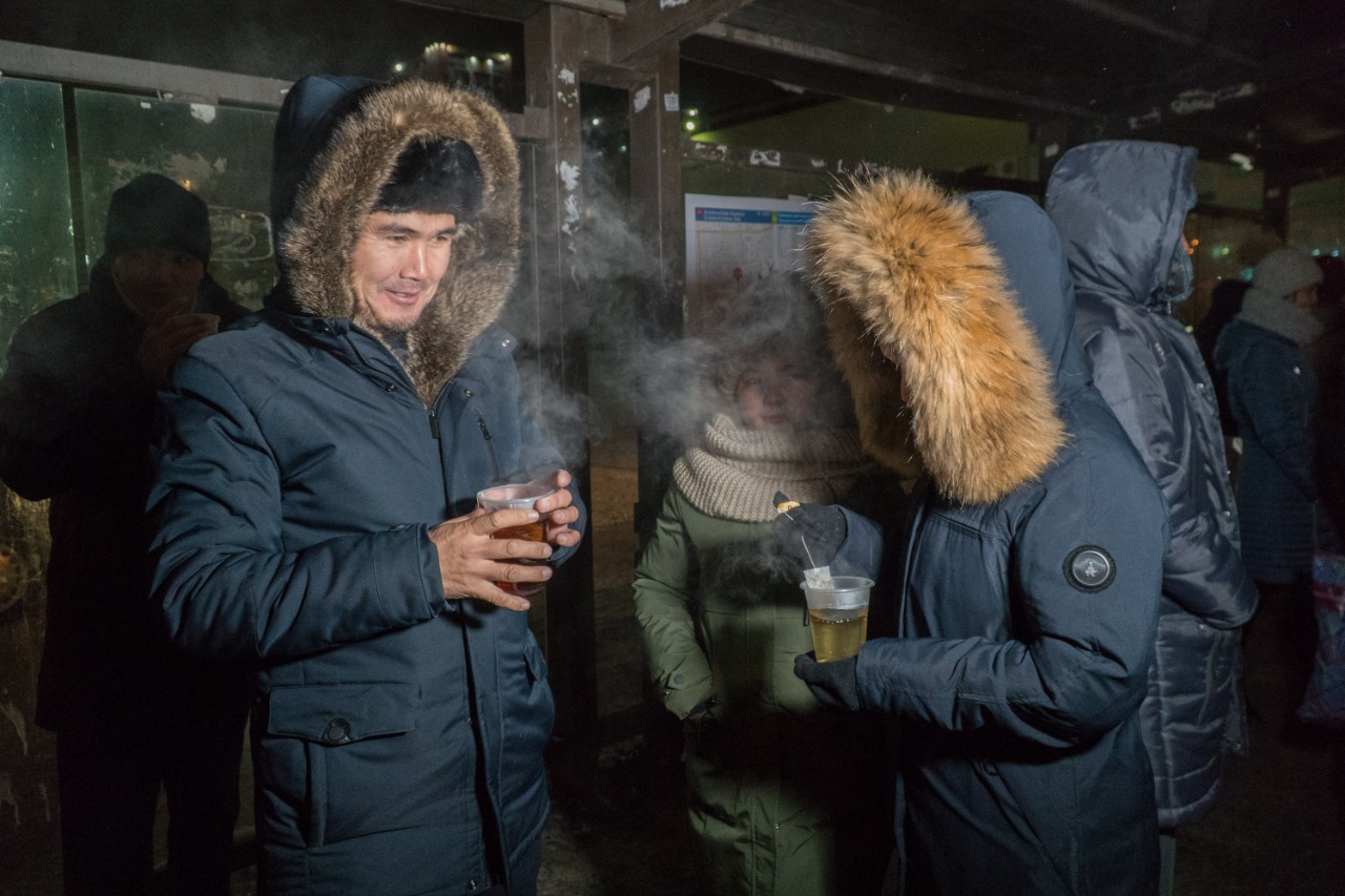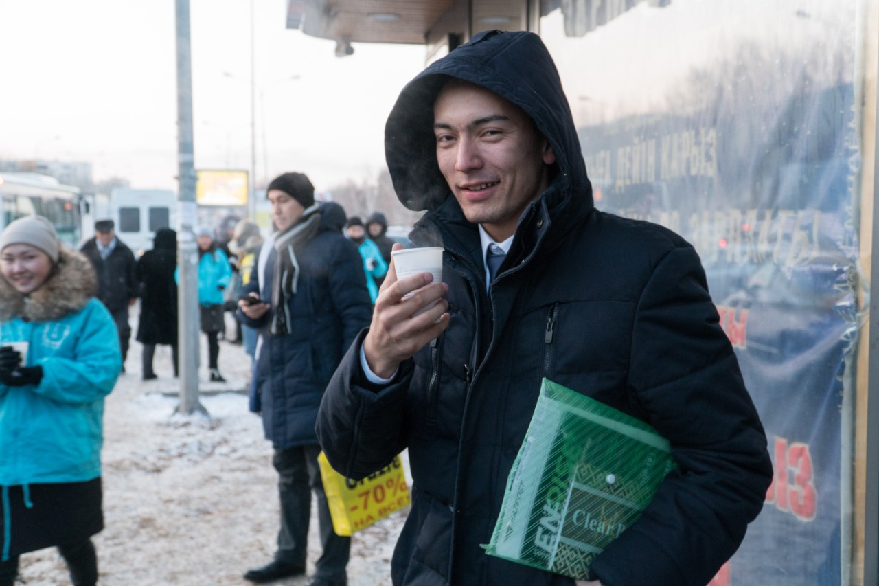 Таңғы сағат 8:00-ден 10:00-ге дейін, сондай-ақ кешкі сағат 18:00-ден 20:00-ге дейін орталықтың 40 еріктісі қаланы аралап, аялдамаларда шай мен кофе таратты. Жастар 1500-ге жуық қала тұрғындарын ыстық сусынмен жылытты. Тоңып қалмау үшін еріктілер ауысыммен жұмыс істеді.