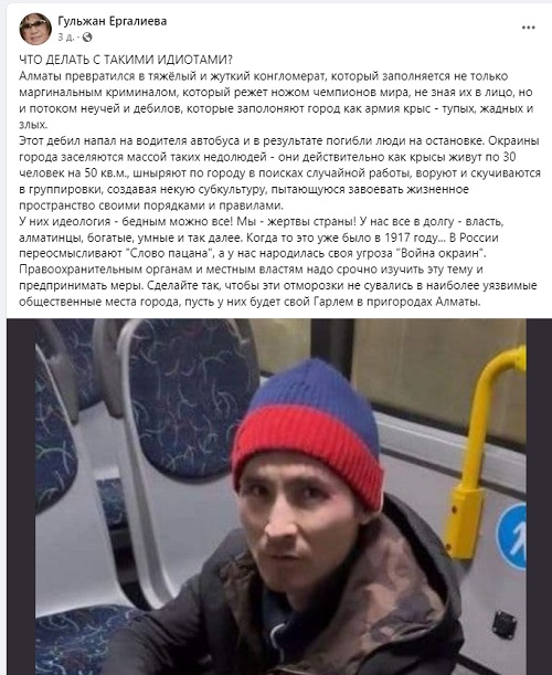 – Бұл ақымақтар автобус жүргізушісіне шабуыл жасап, соның кесірінен аялдамада тұрған қарапайым адамдар қаза тапты. Қаланың шетінде осындай бейадамдардың көп қоныстанған – олар егеуқұйрықтар сияқты өмір сүреді. 50 шаршы метр бөлмеде 30 адам болып тұра береді (құдды солардың үйіне күнде барып, шай ішіп жүрген адамдай гәпіріпті). Мұндай адамдар қалада күмәнді жұмыс істеп, топтасып ұрлық жасап, Алматыда субмәдениет қалыптастыруда, – деп лағып кетіпті.