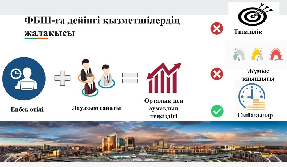 Оның айтуынша, аталған жүйе мемлекеттік қызметшілердің өз істеріне үлкен жауапкершілікпен қарап, сапалы жұмыс істеуіне жетелейді. Бұған қоса, жыл соңында жұмыс нәтижесінің тиімділігіне сәйкес қосымша бонустар берілмек.