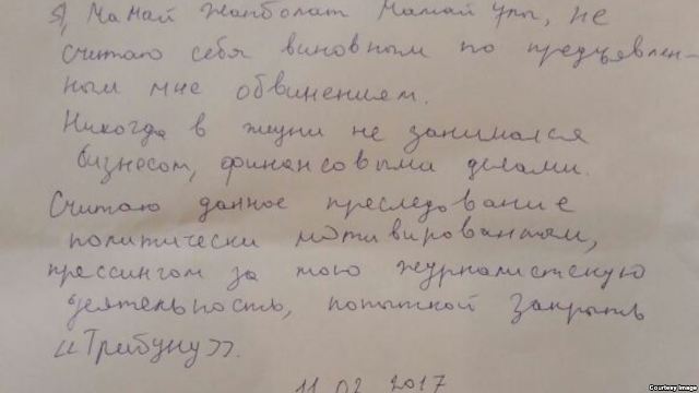 Мәлімдемеде "Жария мәлімдеме. Мен, Мамай Жанболат Мамайұлы, тағылған айыптар бойынша өзімді кінәлі деп санамаймын. Өмірімде бизнеспен, қаржылық шаруалармен айналысқан емеспін. Бұл істі саяси астары бар деп, журналистік қызметіме қысым және "Трибуна" газетін жабу әрекеті деп есептеймін" деп қолмен жазылған. Мәлімдеменің соңында 11 ақпан күні жазылғаны белгіленіп, Жанболат Мамайдың қолы қойылған.