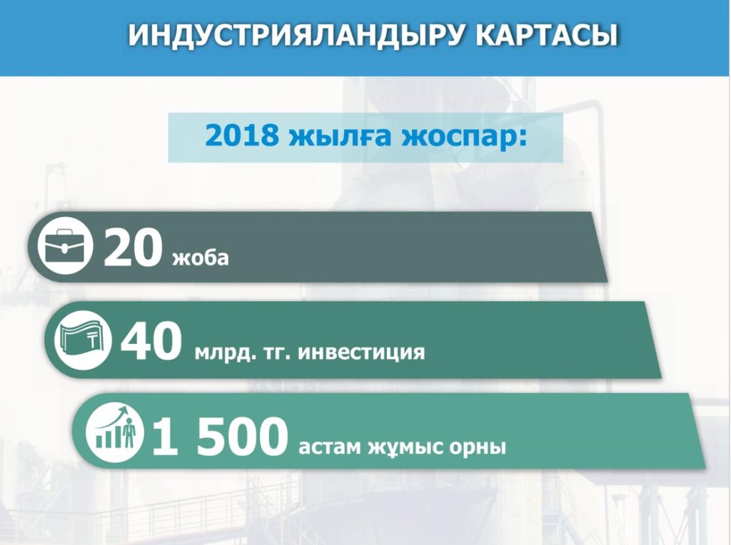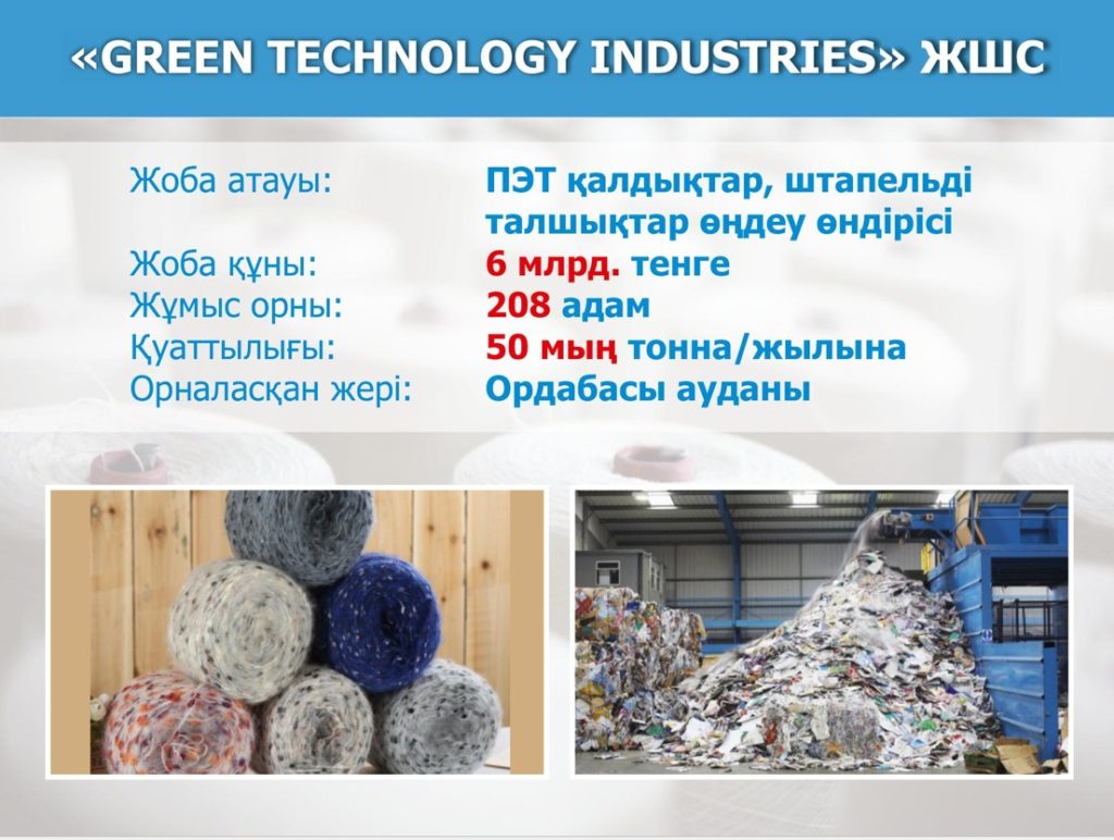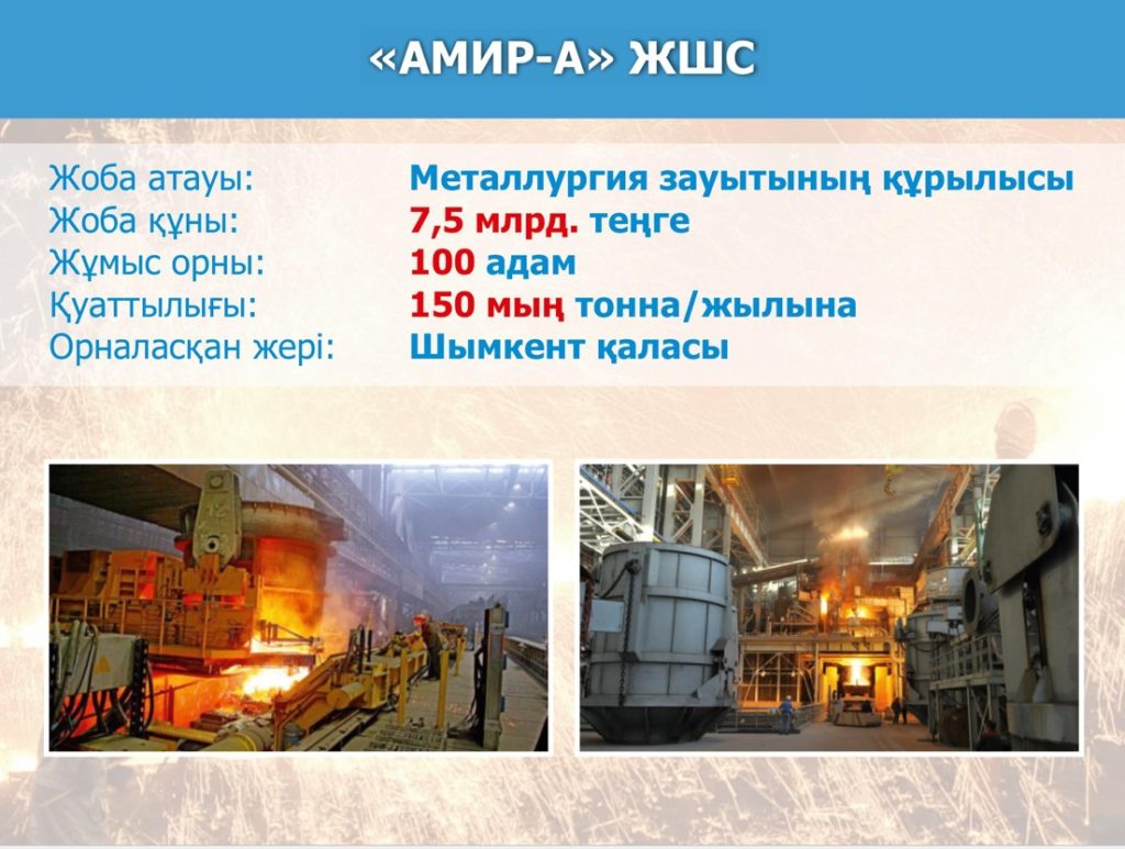 Аталған жобалардың бірқатарына тоқталсақ. Олар «Амир-А» ЖШС-нің 7,5 млрд. теңгеге жылына 150 мың тонна металл өнімдерін шығаратын металлургия зауытының құрылысы. Зауыт іске қосылғанда 100 жаңа жұмыс орны құрылады. Ал «Green Technology Industries» ЖШС-гі 6 млрд. теңгеге 208 жұмыс орнын қалыптастырып, жылына 50 мың тонна полиэтилен қалдықтарын қайта өңдеп, штапельді талшық шығаратын болады. «Аsia Trafo» АҚ-ы 15,9 млрд. теңгеге 220 жұмыс орнын құрып, кернеу сыныбы 110-220 кВт күштік трансформатор өндіретін болады.