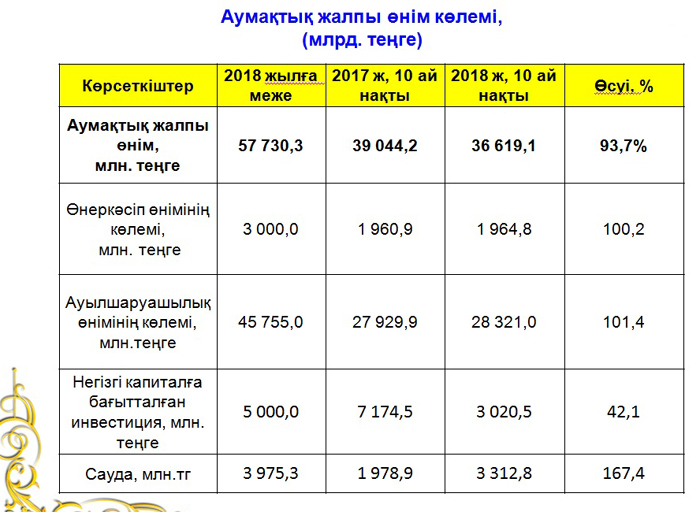 2018 жылдың 10 айында өндірілген аумақтық жалпы өнім көлемі 36,6 млрд теңге құрап, тиісті кезеңмен салыстырғанда 2,4 млрд. теңгеге немесе 93,7 пайызды құраған болса, оның 28,3 млрд теңгесі немесе 77,3 пайызы ауыл шаруашылығының үлесінде.