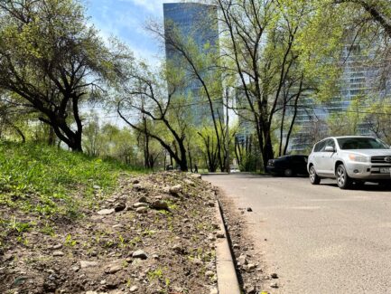 Бұл – Есентай Сити коттеджді қалашағының алаңшасы. Ары қарай Алматыдағы ең қымбат Хейлибери мектебінің автотұрағы басталады. Қоқыс шашылып жатыр.