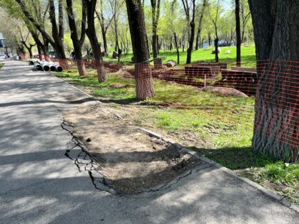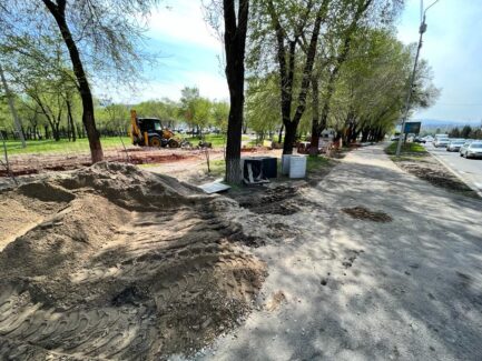 Жақын маңда қоршалған аумақта құрылыс/жөндеу жұмыстары жүріп жатыр. Трактор тротуарды ойып жіберген, онымен қатар, балшықтың бәрін көшеге тасып, бордюрден сау тамтық қалдырмаған.