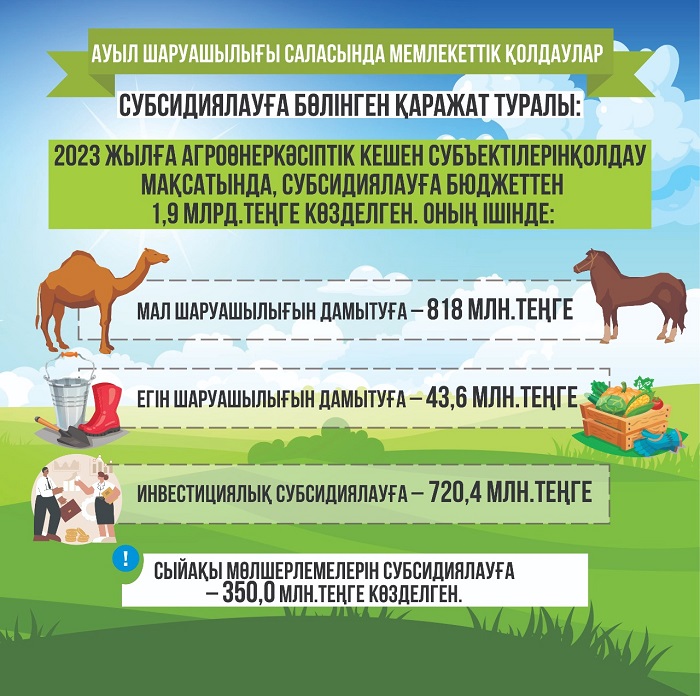 – Ауыл шаруашылығы саласы ел экономикасының негізгі салаларының бірі. Биыл шағын және орта бизнес кәсіпкерлерін, шаруа қожалықтарын қолдау мақсатында субсидиялауға бюджеттен 1,9 млрд теңге бөлінді. Атап айтқанда, мал шаруашылығын дамытуға – 818 млн.теңге, егін шаруашылығын дамытуға – 43,6 млн теңге, инвестициялық субсидиялауға – 720,4 млн теңге, сыйақы мөлшерлемелерін субсидиялауға – 350 млн теңге бөлінеді, – деді Қазбек Тәшімов.