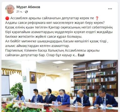 Белгілі саясаткер, қоғам белсендісі Мұрат Әбенов өзінің Фейсбуктағы парақшасында «Қантар оқиғасының» негізгі себептерінің бірі қарапайым азаматтардың мүдделерін қорғап, елдегі жағдайды билікке жеткізетін жүйелі саяси құрал болмаудан туындағанын айтты, сонымен қатар ол Қазақстан халқы Ассамблеясынан сайланатын депутаттарға қатысты ойын да ортаға салды, – деп хабарлайды Dalanews.kz.