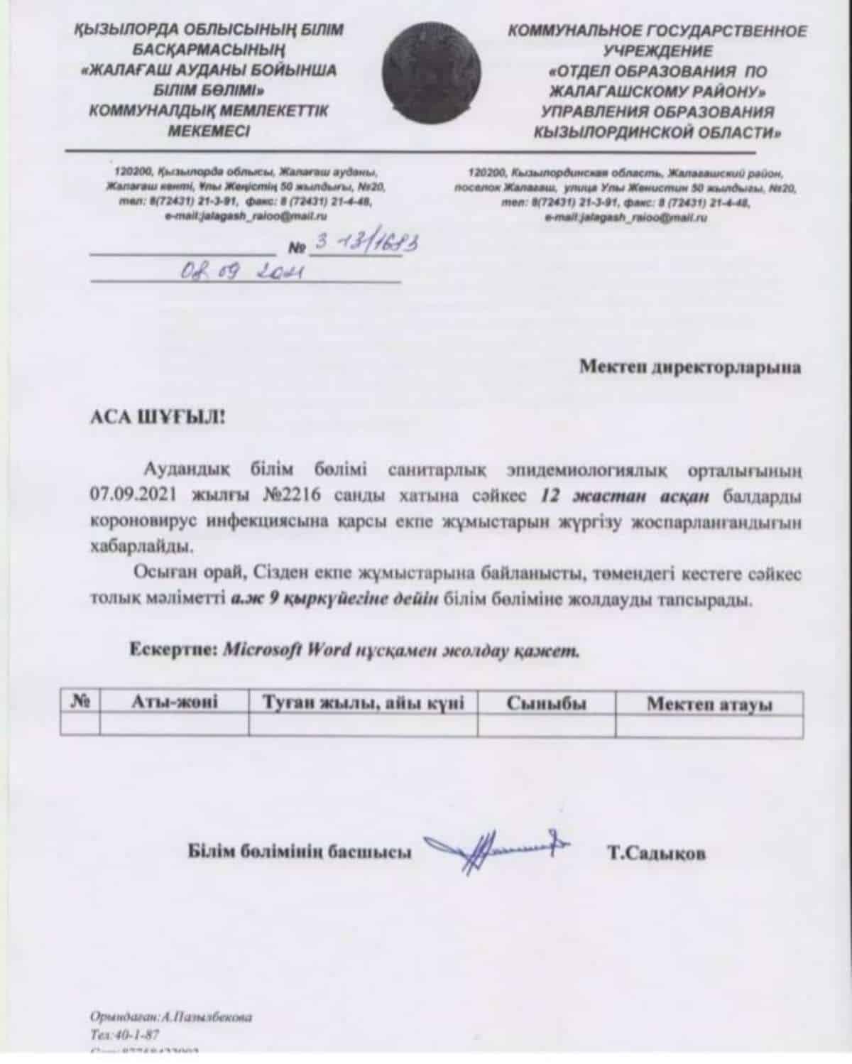 Онда екпе алатын 12 жастан асқан оқушылардың барлық мәліметі жинақталған кесте басшылыққа жетуі тиіс болғаны айтылады.