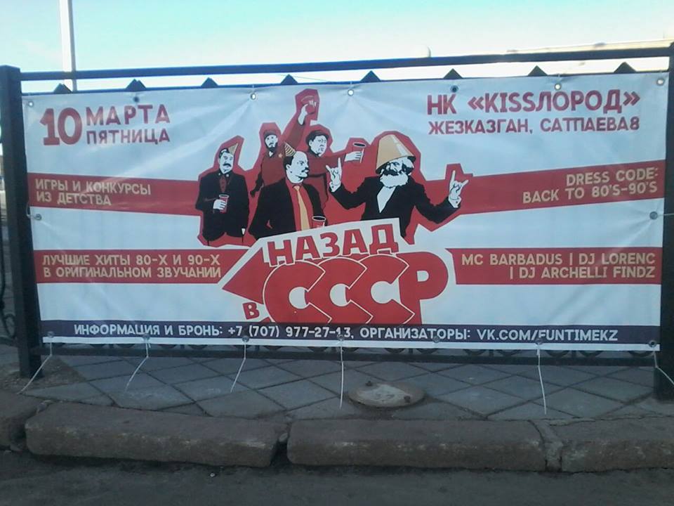 "Назад в СССР" немесе "КСРО-ға қайта оралу". Жезқазғандағы "Кислород" атты түнгі клуб дәл осындай атаумен би кешін өткізбек екен (суретте). Ертең...