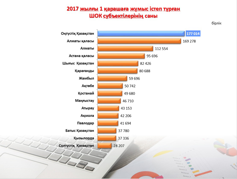 Департамент басшысының мәліметінше, облыста жұмыс істеп тұрған шағын және орта кәсіпкерлік субъектілерінің саны 1 қарашаға 177 014 бірлікті құраған. Бұл өткен жылдың тиісті кезеңімен салыстырғанда 4,9 пайызға жоғары. Ал, осы шағын және орта кәсіпкерлікте 357 412 адам жұмыспен қамтылса, тауарлар, қызмет көрсетулер бойынша 381 632 млн. теңгенің өнімі шығарылған.