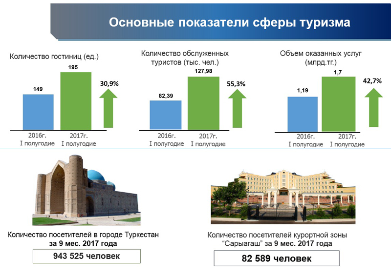 Оның айтуынша, облыста биыл туризм саласының қарқынды дамуы байқалады. Өткен жылмен салыстырғанда туристік нысандар саны 31 пайызға өсіп, 195-ті құраған. Ал оларда 1,7 млрд.теңгенің көлемінде қызметтер көрсетіліп, қызметтер көлемі 43 пайызға жеткен.