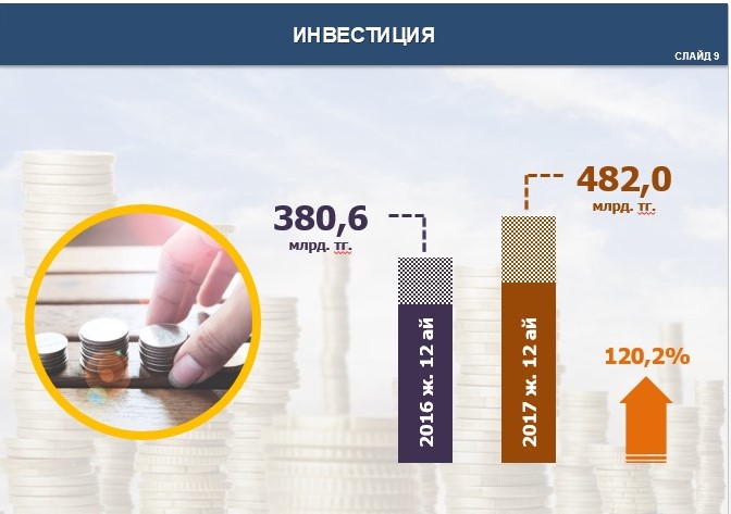 – 2017 жылы өңірімізде Индустрияландыру картасы аясында 18 жоба жүзеге асырылып, 36,5 млрд. теңге инвестиция бағытталды. 2017 жылы жұмыс істеп тұрған шағын және орта кәсіпкерлік субъектілерінің саны 180 мыңға жуықтап, облыс республика көлемінде алдыңғы орынды иеленді, – деді Арман Сәбитұлы.