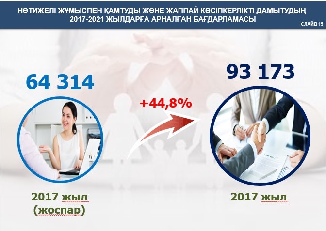 Басқарма басшысының айтуынша, 2017 жылы 93 мыңнан астам адам «Нәтижелі жұмыспен қамтуды және жаппай кәсіпкерлікті дамытудың 2017-2021 жылдарға арналған бағдарламасымен» қамтылып, жоспар 44,8 пайызға артығымен орындалыпты. Сондай-ақ, өткен жылы 83 мыңға жуық жаңа жұмыс орны ашылған.