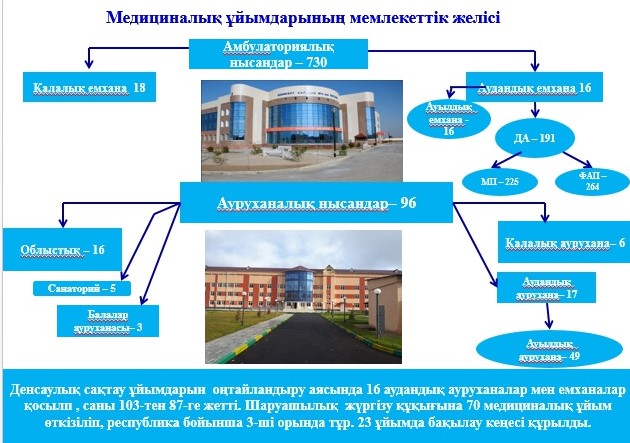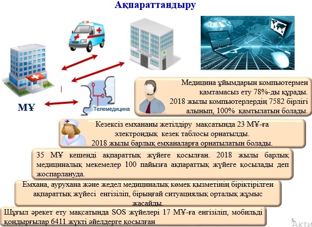 Сонымен қатар, 35 медициналық ұйым кешенді ақпараттық жүйеге қосылған. 2018 жылы барлық медициналық мекемелер 100 пайызға ақпараттық жүйеге қосылады деп жоспарлануда. Алдағы уақытта өңірде емхана, аурухана және жедел медициналық көмек қызметінің біріктірілген ақпараттық жүйесі  енгізіліп, бірыңғай ситуациялық орталық жұмыс жасайтын болады.