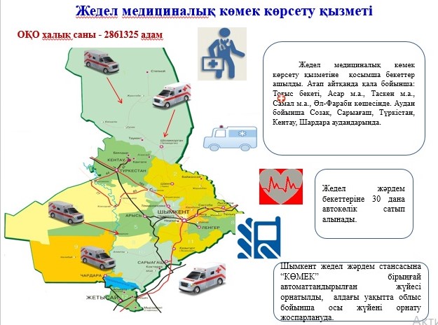 Айта кетерлігі, өткен жылы облыста бюджет есебінен 33 нысан салынды. Атап айтқанда, Шымкент қалалық жедел жәрдем көрсету ауруханасы мен облыстық онкологиялық диспансерінің корпусы, 1 аудандық емхана, 7 дәрігерлік амбулатория, 18 фельдшерлік-акушерлік және 5 медициналық пункт пайдалануға берілген болатын.