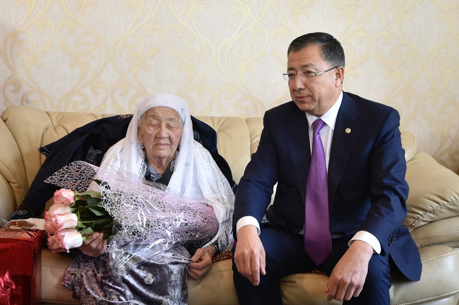 Қазыналы қартты мейраммен құттықтап, ыстық лебізін білдірген аймақ басшысы қарияға сыйлығын табыстады.