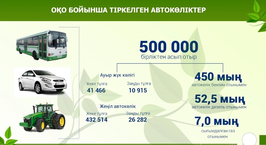Басқарма басшысының айтуынша, былтыр облыста 500 мыңнан астам автокөлік тіркелген. Оның ішінде бензинмен – 450 мың, дизель отынымен – 53 мың, сығымдалған газ отынымен – 4 мыңнан астам автокөлік бар. Шымкент қаласы бойынша 1700-ге жуық қоғамдық көлік қызмет көрсетеді, оның 533-і газ отынымен жүруге жабдықталған.